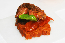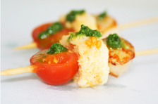 - Queso de cabra y tomatito relleno de tapenade de aceituna con alcaparras