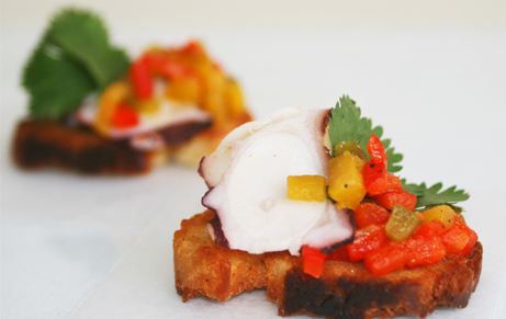 - Pulpo escabechado, pimentón rostizado, oliva y cilantro